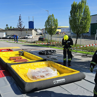 Übungsannahme war ein Chlorgasunfall mit Menschenrettung. Nach der Rettung der verunfallten Personen wurde die beschädigte Gasflasche abgedichtet. Besonders die Dekontamination von Ausrüstung und geretteten Personen sowie der Einsatzkräfte stand dabei für uns im Fokus.